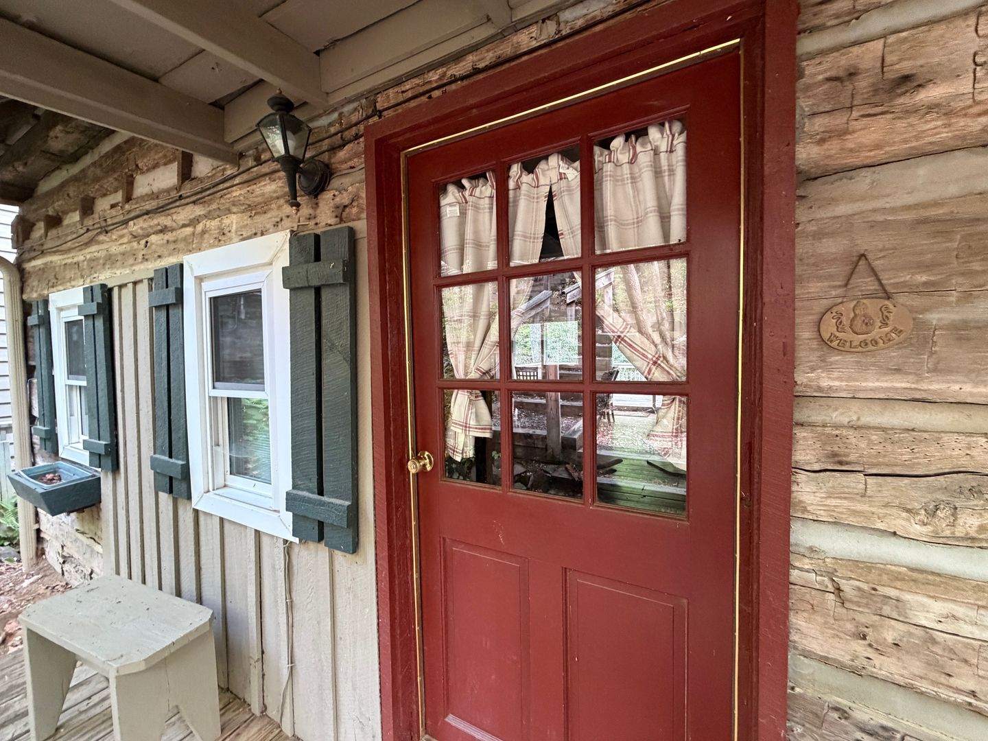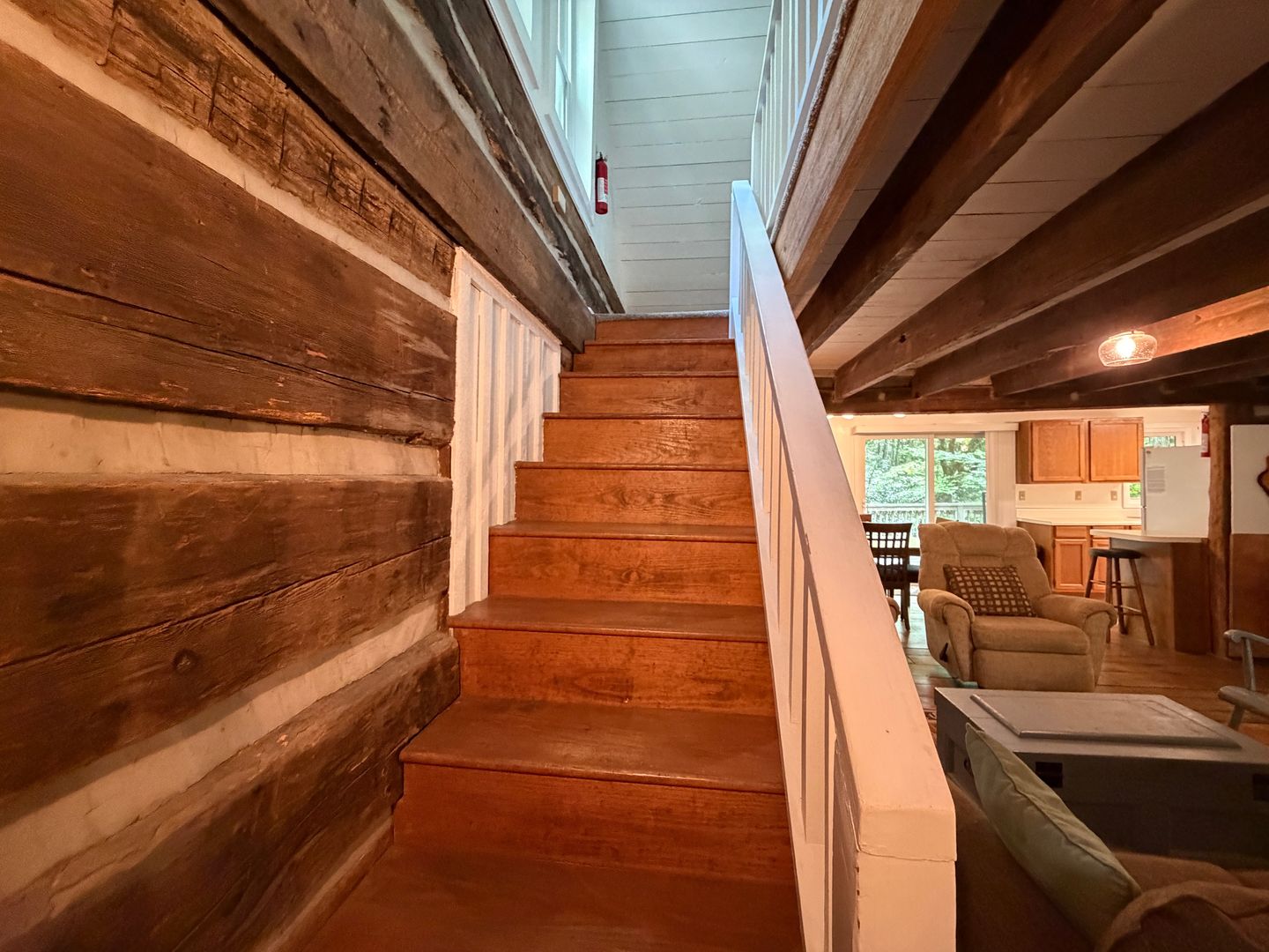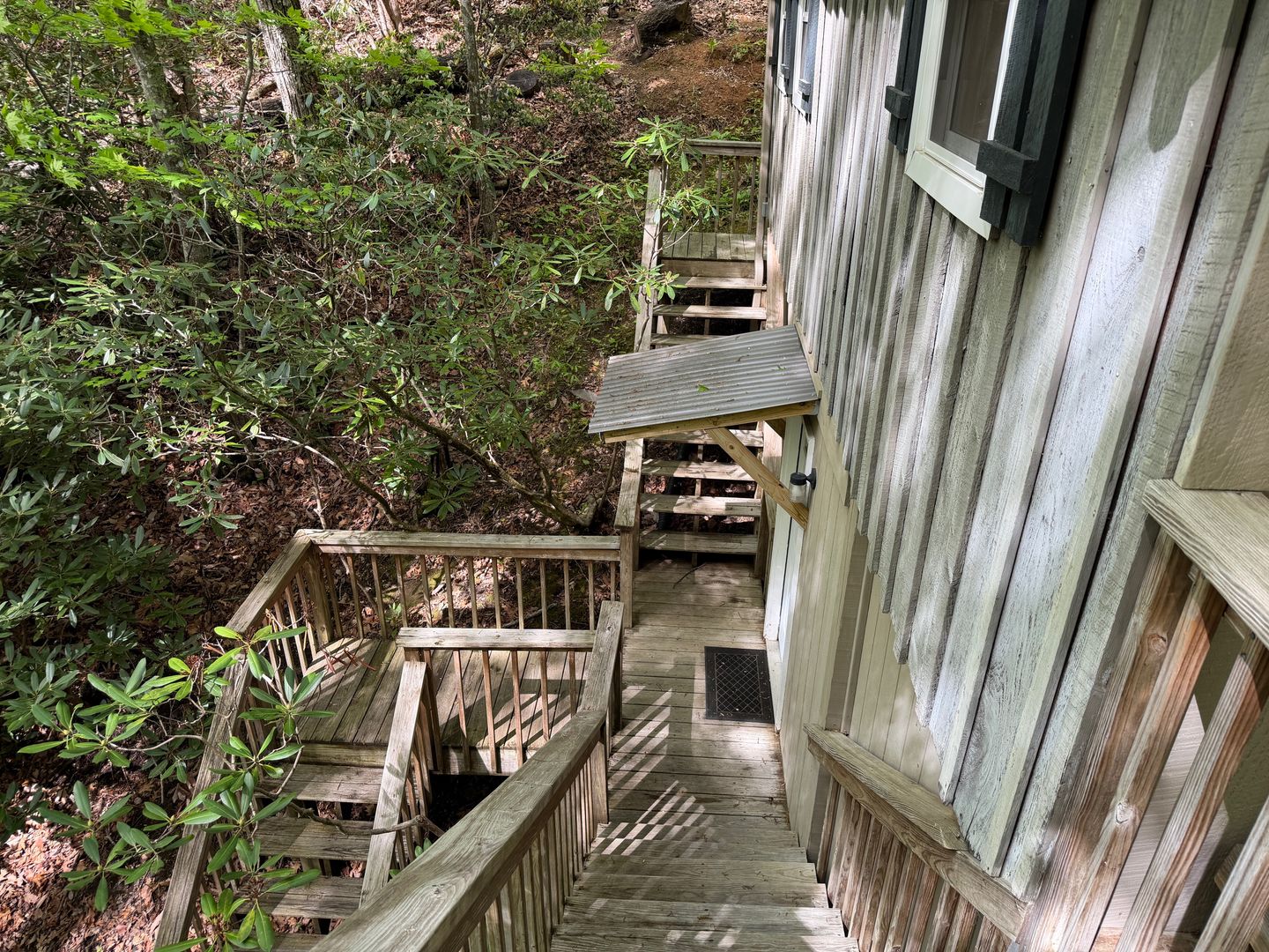 There are multiple stairs to the cabin from the parking spot.
